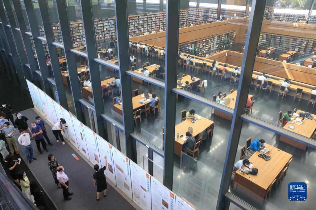 在北京國(guó)家圖書館,工作人員介紹“經(jīng)典,予生活以詩(shī)意——‘文津經(jīng)典誦讀’十周年主題展”(2022年9月7日攝)。新華社記者 殷剛 攝